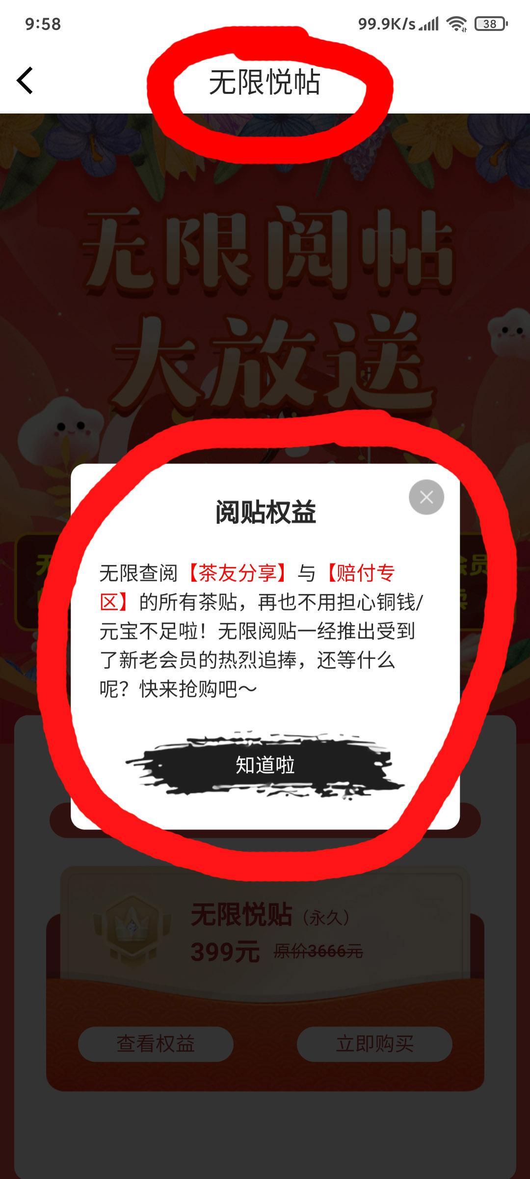 会员账号为无限悦贴会员,可以无限解锁“茶友分享”和“赔付专区”2个板块的茶贴。